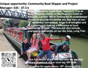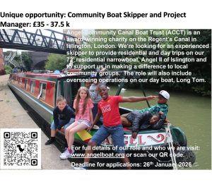 The Angel Boat is a charity (Angel Community Canal Boat Trust or ACCT) which operates two skippered community canal boats – ‘Angel II of Islington’ and ‘Long Tom’ – for use by local residents and community groups of all ages at a cost they can afford. We have been operating from our base at Angel, Islington, London since 1976, providing some 2000 young people and other disadvantaged and isolated local community groups with residential and day trips under the supervision of our experienced skipper.