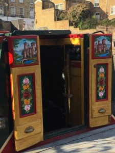 Thanks to funding from the Inland Waterways Association the rear doors of the Angel Boat have been repainted in traditional style. Covered in a story in the Islington Tribune Sophie Harris-Greenslade (aka The Illustrated Nail) has completed her first venture as canal artist, replacing the artwork which had faded over 20 years of exposure to the elements with fresh but traditional roses and castles.